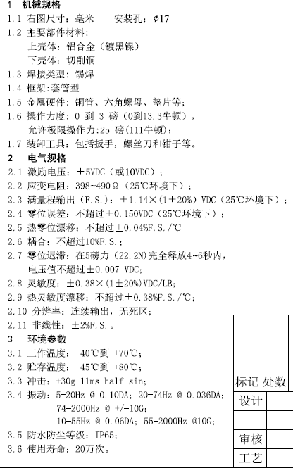 標(biāo)準(zhǔn)靈敏值是當(dāng)電源電壓±6伏的時候,每磅0.45伏(每牛頓0.10伏)??筛鶕?jù)要求提供其他靈敏值。