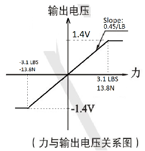 微型二維力敏傳感操控裝置采用了限制偏轉(zhuǎn)和防損壞的機械設(shè)計。電壓信號完全達到的區(qū)域稱為線性工作范圍。在這范圍內(nèi),輸出與輸入的靈敏度系數(shù)“S”有關(guān)。隨著力度增加超過靜止?fàn)顟B(tài),輸出隨著力度增加而減弱。停止后的標(biāo)準(zhǔn)靈敏度約為-20mv/磅。不建議在機械停止后操作。