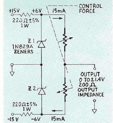 注:±15伏的直流電壓應(yīng)用可以通過兩個220歐姆電阻與±15伏的電源串聯(lián)使用。這個電路可以將源阻抗增加到450歐姆。