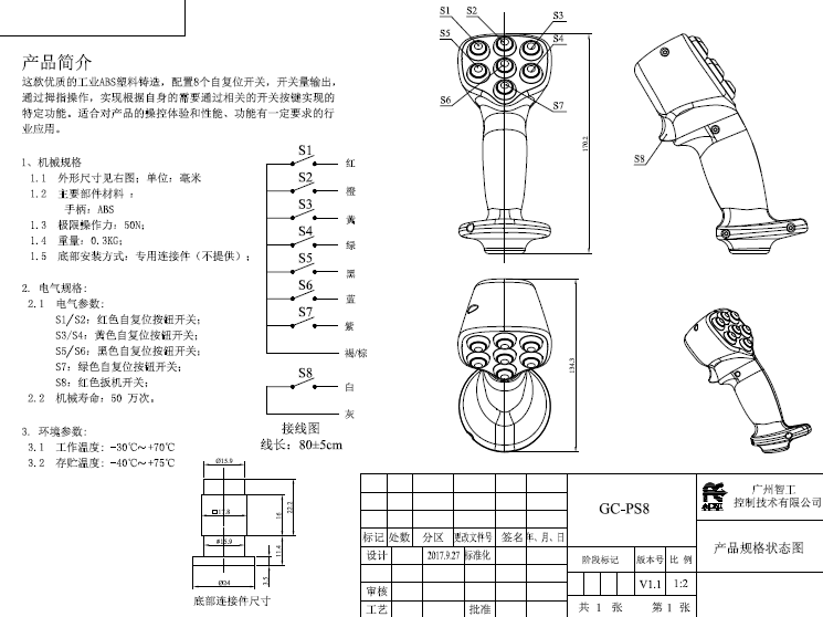 GC-PS8,該產(chǎn)品符合人體工程學(xué)設(shè)計,采用優(yōu)質(zhì)的工業(yè)級ABS注塑成型,開關(guān)量輸出,配置8個優(yōu)質(zhì)的防水開關(guān)(1扳機+7按鍵),手握桿柄通過拇指操作,根據(jù)自身的需要通過相關(guān)的開關(guān)實現(xiàn)特定的功能,滿足對操控體驗和性能、功能有一定要求的行業(yè)應(yīng)用,具有壽命長、操作舒適、配置靈活等優(yōu)點,適用于工程機械、農(nóng)業(yè)器械、醫(yī)療設(shè)備、儀器儀表、廣播電視設(shè)備等。
